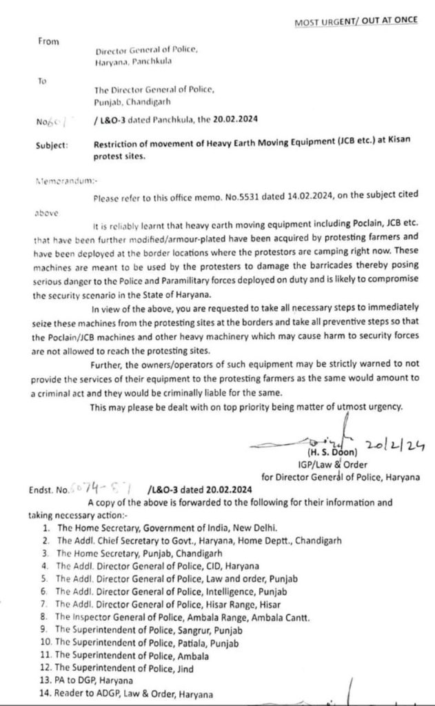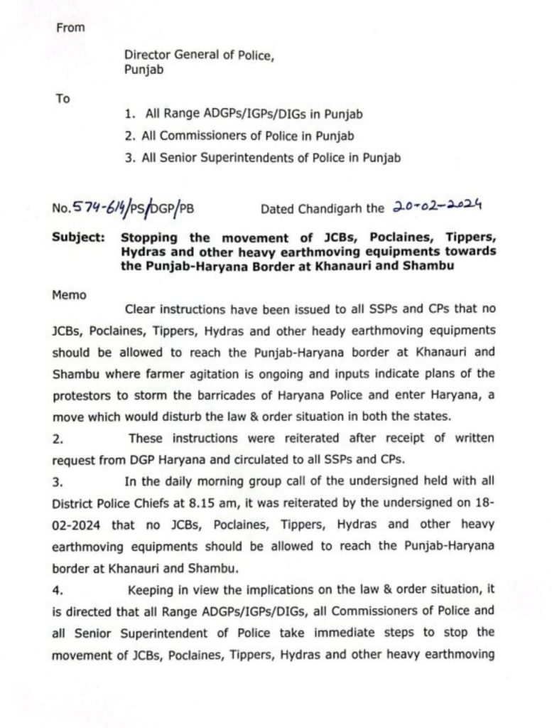 ਹਰਿਆਣਾ DGP ਨੇ ਪੰਜਾਬ ਡੀਜੀਪੀ ਨੂੰ ਚਿੱਠੀ ਲਿਖੀ ਆ ਜਿਸ ਚ’ ਉਨ੍ਹਾਂ ਨੇ ਲਿਖਿਆ ਕਿ ਸ਼ੰਭੂ ਤੇ ਖਨੌਰੀ ਬਾਡਰਾਂ ਤੋਂ JCB ਤੇ ਪੋਲਕੇਨ ਮਸ਼ੀਨਾਂ ਹਟਾਈਆਂ ਜਾਣ