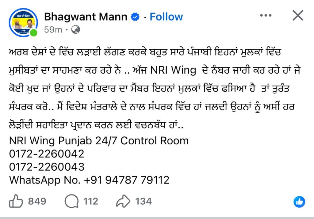 ਅਰਬ ਦੇਸ਼ਾਂ ਦੇ ਵਿੱਚ ਲੜਾਈ ਲੱਗਣ ਕਰਕੇ ਬਹੁਤ ਸਾਰੇ ਪੰਜਾਬੀ ਇਨ੍ਹਾਂ ਮੁਲਕਾਂ ਵਿੱਚ ਮੁਸ਼ਕਿਲਾਂ ਦਾ ਸਾਹਮਣਾ ਕਰ ਰਹੇ ਨੇ.. ਅਸੀਂ NRI Wing ਦੇ ਨੰਬਰ ਜਾਰੀ ਕਰ ਰਹੇ ਹਾਂ ਜੇ ਕੋਈ ਖ਼ਤਰੇ ਜਾਂ ਉਥੋਂ ਦੇ ਪਰਿਵਾਰ ਦਾ ਮੈਂਬਰ ਇਨ੍ਹਾਂ ਮੁਲਕਾਂ ਵਿੱਚ ਫਸਿਆ ਹੈ ਤਾਂ ਤੁਰੰਤ ਸੰਪਰਕ ਕਰੋ.. ਮੈਂ ਵਿਦੇਸ਼ ਮੰਤ੍ਰਾਲੇ ਦੇ ਨਾਲ ਸੰਪਰਕ ਵਿੱਚ ਹਾਂ ਜਲਦੀ ਉਨ੍ਹਾਂ ਨੂੰ ਅਸੀਂ ਹਰ ਲੋੜੀਂਦੀ ਸਹਾਇਤਾ ਪੁਹਚਾਉਣ ਲਈ ਵਚਨਬੱਧ ਹਾਂ..