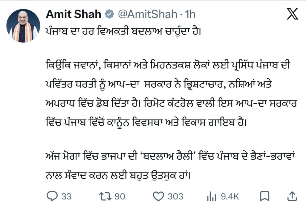ਅਮਿਤ ਸ਼ਾਹ ਨੇ ਸੋਸ਼ਲ ਮੀਡੀਆ ਪਲੇਟਫਾਰਮ ‘ਐਕਸ’ (Twitter) ‘ਤੇ ਪੋਸਟ ਸਾਂਝੀ ਕਰਦਿਆਂ ਲਿਖਿਆ ਕਿ ਪੰਜਾਬ ਦਾ ਹਰ ਨਾਗਰਿਕ ਹੁਣ ਬਦਲਾਅ ਦੀ ਉਡੀਕ ਕਰ ਰਿਹਾ ਹੈ। ਉਨ੍ਹਾਂ ਕਿਹਾ: