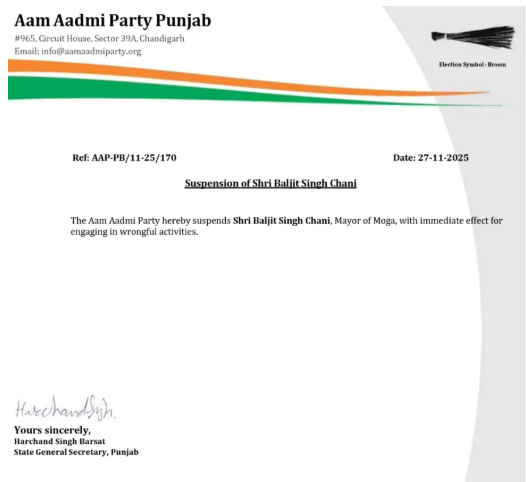 ‘ਆਪ’ ਦੇ ਸੂਬਾ ਜਨਰਲ ਸਕੱਤਰ ਹਰਚੰਦ ਸਿੰਘ ਬਰਸਟ ਨੇ ਅਧਿਕਾਰਤ ਮੁਅੱਤਲੀ ਹੁਕਮ ਜਾਰੀ ਕਰਦਿਆਂ ਸਪੱਸ਼ਟ ਕੀਤਾ ਕਿ ਪਾਰਟੀ ਨਸ਼ਿਆਂ, ਭ੍ਰਿਸ਼ਟਾਚਾਰ ਅਤੇ ਪੰਜਾਬ ਦੇ ਹਿੱਤਾਂ ਨੂੰ ਨੁਕਸਾਨ ਪਹੁੰਚਾਉਣ ਵਾਲੀਆਂ ਗਤੀਵਿਧੀਆਂ ਪ੍ਰਤੀ ਜ਼ੀਰੋ-ਟੌਲਰੈਂਸ ਦੀ ਨੀਤੀ ਰੱਖਦੀ ਹੈ।