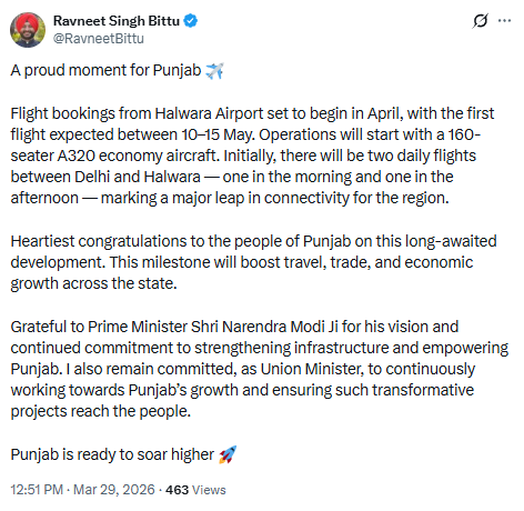 ਲੁਧਿਆਣਾ : ਪੰਜਾਬ ਦੇ ਬੁਨਿਆਦੀ ਢਾਂਚੇ ਅਤੇ ਕਨੈਕਟੀਵਿਟੀ ਲਈ ਅੱਜ ਇੱਕ ਇਤਿਹਾਸਕ ਦਿਨ ਹੈ। ਕੇਂਦਰੀ ਰਾਜ ਮੰਤਰੀ ਰਵਨੀਤ ਸਿੰਘ ਬਿੱਟੂ ਨੇ ਸੋਸ਼ਲ ਮੀਡੀਆ ਰਾਹੀਂ ਜਾਣਕਾਰੀ ਸਾਂਝੀ ਕੀਤੀ ਹੈ ਕਿ ਲੰਬੇ ਸਮੇਂ ਤੋਂ ਉਡੀਕੇ ਜਾ ਰਹੇ ਹਲਵਾਰਾ ਹਵਾਈ ਅੱਡੇ (Halwara Airport) ਤੋਂ ਹਵਾਈ ਸੇਵਾਵਾਂ ਜਲਦ ਸ਼ੁਰੂ ਹੋਣ ਜਾ ਰਹੀਆਂ ਹਨ