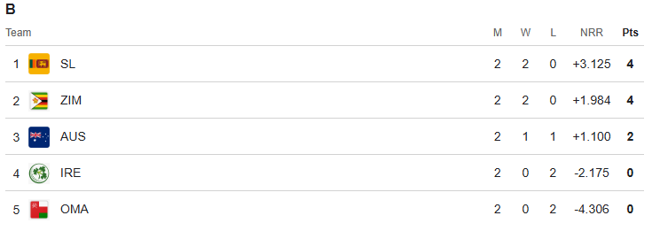 ਜੇਕਰ ਆਸਟ੍ਰੇਲੀਆ ਆਪਣੇ ਅਗਲੇ ਮੈਚ ਜਿੱਤ ਲੈਂਦਾ ਹੈ ਅਤੇ ਦੂਜੇ ਪਾਸੇ ਜ਼ਿੰਬਾਬਵੇ ਸ੍ਰੀਲੰਕਾ ਨੂੰ ਹਰਾ ਦਿੰਦਾ ਹੈ, ਤਾਂ ਆਸਟ੍ਰੇਲੀਆ ਅਤੇ ਜ਼ਿੰਬਾਬਵੇ ਸਿੱਧੇ ਤੌਰ ‘ਤੇ ਕੁਆਲੀਫਾਈ ਕਰ ਜਾਣਗੇ। ਇਸ ਸਥਿਤੀ ਵਿੱਚ ਸ੍ਰੀਲੰਕਾ ਟੂਰਨਾਮੈਂਟ ਤੋਂ ਬਾਹਰ ਹੋ ਜਾਵੇਗਾ ਅਤੇ ਰਨ ਰੇਟ ਦਾ ਰੌਲਾ ਵੀ ਖਤਮ ਹੋ ਜਾਵੇਗਾ