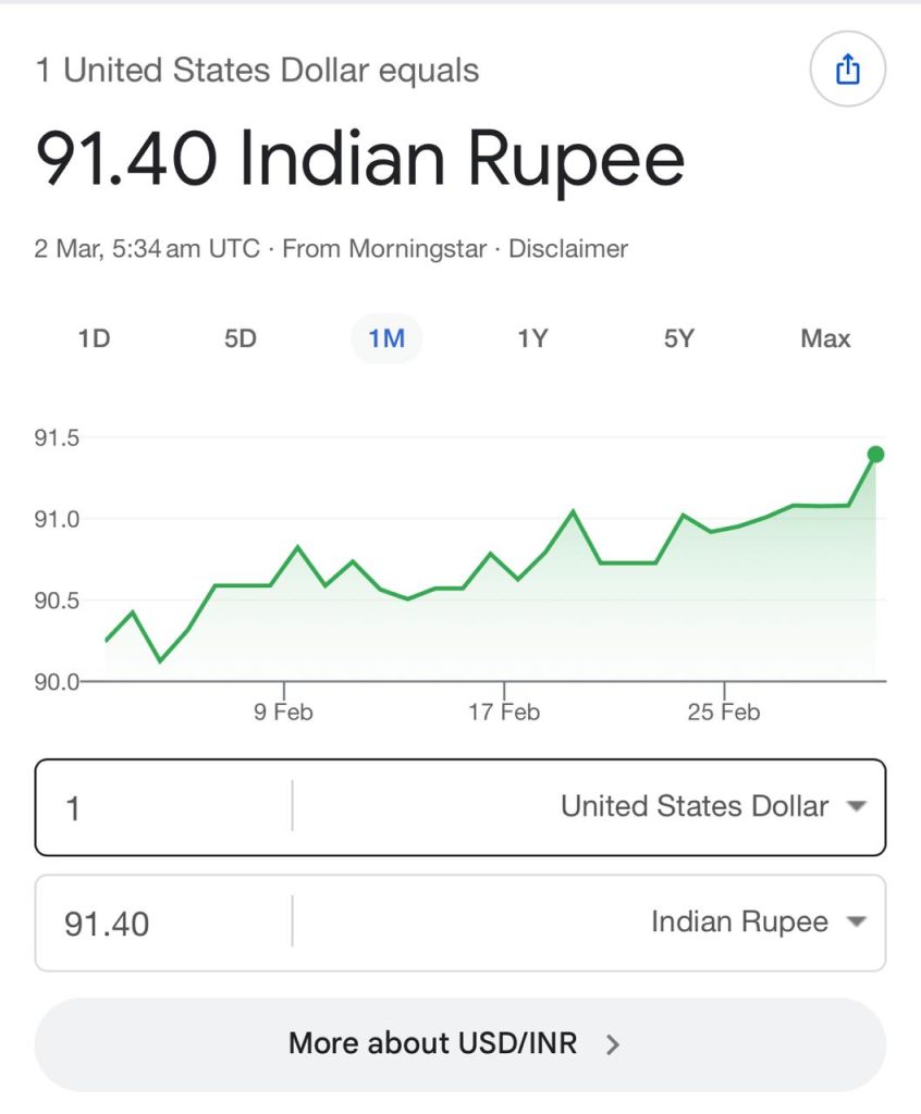 ਰੁਪਏ ਦੀ ਗਿਰਾਵਟ: ਰੁਪਿਆ 91/$ ਦੇ ਅੰਕੜੇ ਨੂੰ ਪਾਰ ਕਰ ਚੁੱਕਾ ਹੈ। ਵਿਸ਼ਲੇਸ਼ਕਾਂ ਮੁਤਾਬਕ ਰੁਪਿਆ 91.50 ਤੱਕ ਡਿੱਗ ਸਕਦਾ ਹੈ ਅਤੇ ਨਵੇਂ ਹੇਠਲੇ ਪੱਧਰਾਂ ਨੂੰ ਛੂਹ ਸਕਦਾ ਹੈ। ਬਾਜ਼ਾਰ ਵਿੱਚ ਅਨਿਸ਼ਚਿਤਤਾ ਬਣੀ ਰਹਿਣ ਦੀ ਉਮੀਦ ਹੈ, ਜਿਸ ਨਾਲ ਆਉਣ ਵਾਲੇ ਦਿਨਾਂ ਵਿੱਚ ਰੁਪਏ ਦੀ ਕੀਮਤ ਵਿੱਚ ਹੋਰ ਉਤਾਰ-ਚੜ੍ਹਾਅ ਦੇਖਣ ਨੂੰ ਮਿਲ ਸਕਦਾ ਹੈ।