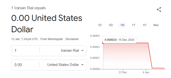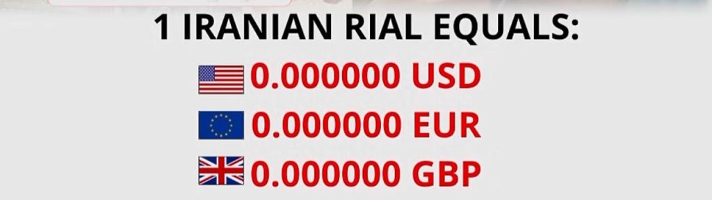ਅੰਤਰਰਾਸ਼ਟਰੀ ਬਾਜ਼ਾਰ ਵਿੱਚ ਈਰਾਨੀ ਕਰੰਸੀ ‘ਰਿਆਲ’ ਦੀ ਕੀਮਤ ਇੰਨੀ ਡਿੱਗ ਚੁੱਕੀ ਹੈ ਕਿ ਹੁਣ ਇਹ ਲਗਭਗ ‘ਜ਼ੀਰੋ’ ਦੇ ਬਰਾਬਰ ਮਹਿਸੂਸ ਹੋ ਰਹੀ ਹੈ।