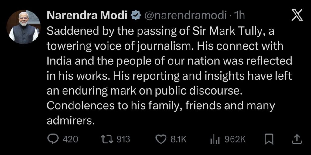 ਪ੍ਰਧਾਨ ਮੰਤਰੀ ਨਰਿੰਦਰ ਮੋਦੀ ਨੇ ਮਾਰਕ ਟੁਲੀ ਦੇ ਨਿਧਨ ‘ਤੇ ਡੂੰਘੇ ਦੁੱਖ ਦਾ ਪ੍ਰਗਟਾਵਾ ਕੀਤਾ ਹੈ। ਉਨ੍ਹਾਂ ਨੇ ਟਵੀਟ (X) ਕਰਦਿਆਂ ਲਿਖਿਆ: