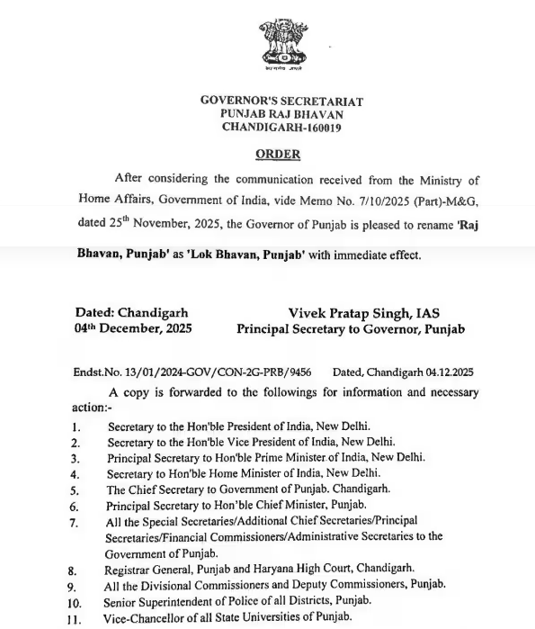ਗਵਰਨਰ ਵੱਲੋਂ ਇਸ ਫੈਸਲੇ ਸੰਬੰਧੀ ਇੱਕ ਅਧਿਕਾਰਤ ਪੱਤਰ ਜਾਰੀ ਕੀਤਾ ਗਿਆ ਹੈ। ਪੱਤਰ ਵਿੱਚ ਦੱਸਿਆ ਗਿਆ ਹੈ ਕਿ ਇਹ ਫੈਸਲਾ ਭਾਰਤ ਸਰਕਾਰ ਦੇ ਗ੍ਰਹਿ ਮੰਤਰਾਲੇ ਤੋਂ ਪ੍ਰਾਪਤ ਹੋਏ ਇੱਕ ਮੈਮੋਰੰਡਮ (Memo No. 7/10/2025 (Part)-M & G, dated 25th November, 2025) ‘ਤੇ ਵਿਚਾਰ ਕਰਨ ਤੋਂ ਬਾਅਦ ਲਿਆ ਗਿਆ ਹੈ