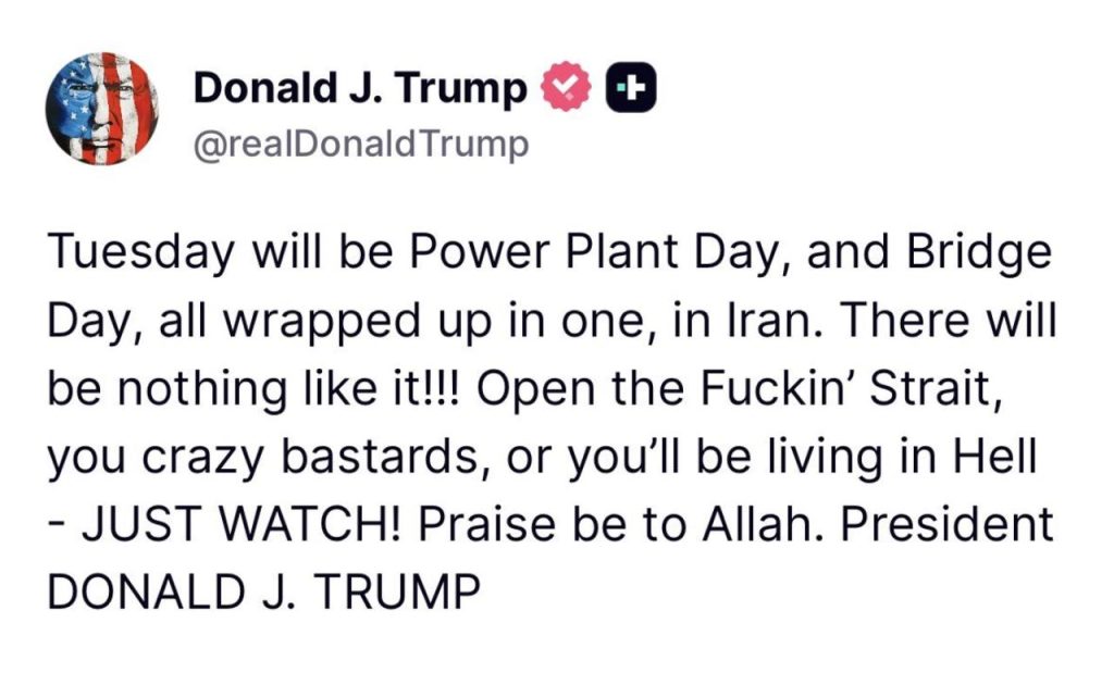“ਮੰਗਲਵਾਰ ਨੂੰ ਇਰਾਨ ਵਿੱਚ ਇੱਕੋ ਦਿਨ ‘ਐਨਰਜੀ ਪਲਾਂਟ ਡੇਅ’ ਅਤੇ ‘ਬ੍ਰਿਜ ਡੇਅ’ ਮਨਾਇਆ ਜਾਵੇਗਾ। ਅਜਿਹਾ ਪਹਿਲਾਂ ਕਦੇ ਨਹੀਂ ਹੋਇਆ ਹੋਵੇਗਾ। ਓਏ ਪਾਗਲੋ, ਜਲਡਮਰੂਮੱਧ ਨੂੰ ਖੋਲ੍ਹ ਦਿਓ, ਨਹੀਂ ਤਾਂ ਨਰਕ ਭੁਗਤਣ ਲਈ ਤਿਆਰ ਰਹੋ। ਰੱਬ ਅੱਗੇ ਪ੍ਰਾਰਥਨਾ ਕਰੋ ਅਤੇ ਦੇਖਦੇ ਰਹੋ ਕਿ ਅੱਗੇ ਕੀ ਹੁੰਦਾ ਹੈ”