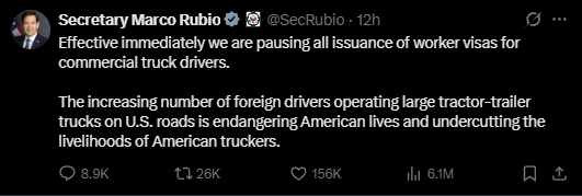 ਵਾਸ਼ਿੰਗਟਨ : ਫਲੋਰੀਡਾ ਚ’ ਪੰਜਾਬੀ ਨੌਜਵਾਨ ਦੇ ਗਲਤ ਤਰੀਕੇ ਨਾਲ ਟਰੱਕ ਮੋੜਨ ਤੇ’ 3 ਅਮੇਰਿਕਨ ਨਾਗਰਿਕਾਂ ਦੀ ਮੌਤ ਹੋ ਗਈ ਸੀ, ਜਿਸ ਤੋਂ ਬਾਅਦ ਹੁਣ ਟਰੰਪ ਸਰਕਾਰ ਐਕਸ਼ਨ ਚ ‘ ਆ ਗਈ ਆ, ਉਨ੍ਹਾਂ ਨੇ ਵਿਦੇਸ਼ੀ ਟਰੱਕ ਡਰਾਈਵਰਾਂ ਤੇ ਵਰਕਰ ਵੀਜ਼ਿਆਂ ਤੇ’ ਰੋਕ ਲਗਾ ਦਿੱਤੀ ਆ ਤੇ ਇਸਦਾ ਸਭ ਤੋਂ ਜ਼ਿਆਦਾ ਅਸਰ ਪੰਜਾਬੀਆਂ ਤੇ ਪਵੇਗਾ | ਸੈਕਟਰੀ ਮਾਰਕੋ ਰੁਬਿਓ ਟਵੀਟ ਕਰ ਲਿਖਿਆ ਆ….